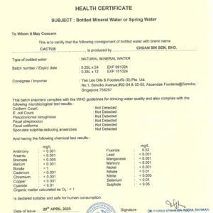 | Source | Cactus Natural Mineral Water is extracted 420ft underground from a vast 330 acre site with plentiful natural mineral water resources in an environmentally friendly site surrounded by lush tropical rain forests greenery, away from pollution which explains why Cactus is rich in minerals. Hygienically filtered and bottled in accordance to international standards. |