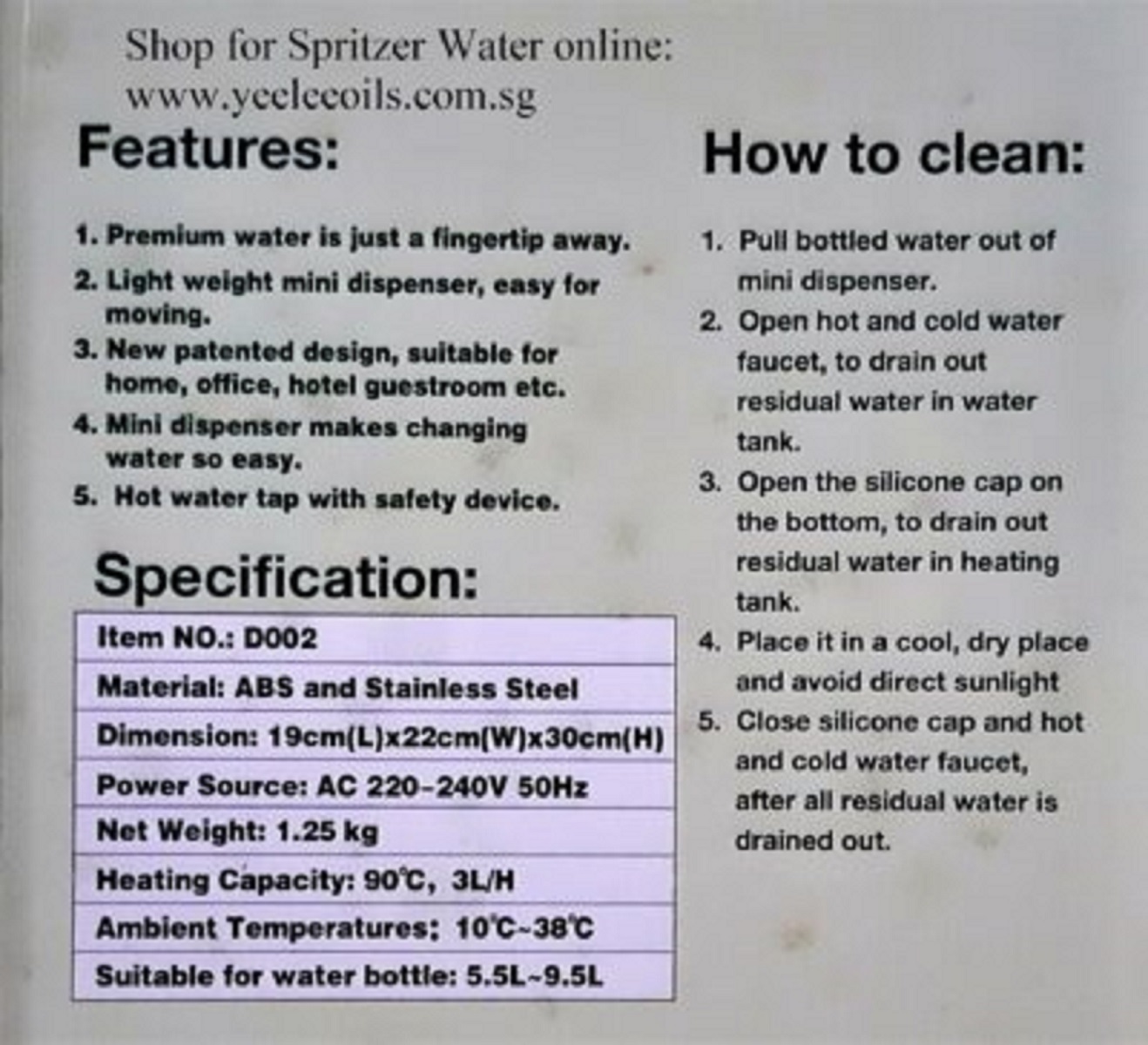 *MINI DISPENSER ONLY, DO NOT INCLUDE BOTTLED WATER.