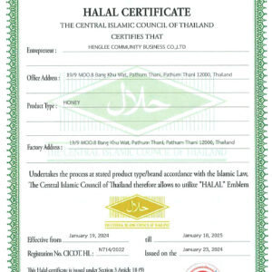 Wild Flower – derived from 100% nectar of Chromolaena Odorata is a beneficial herb that can be found easily in Northern Thailand. This Wild flower honey has many medicinal properties and benefits recognised by worldwide medical community as the best honey . Benefits from consumptions: Instant Energy Booste, aid in digestion and a stomach tonic. Relieve constipation, remedies for hang over. Use for face or body mask with excellent moisturizng effect.